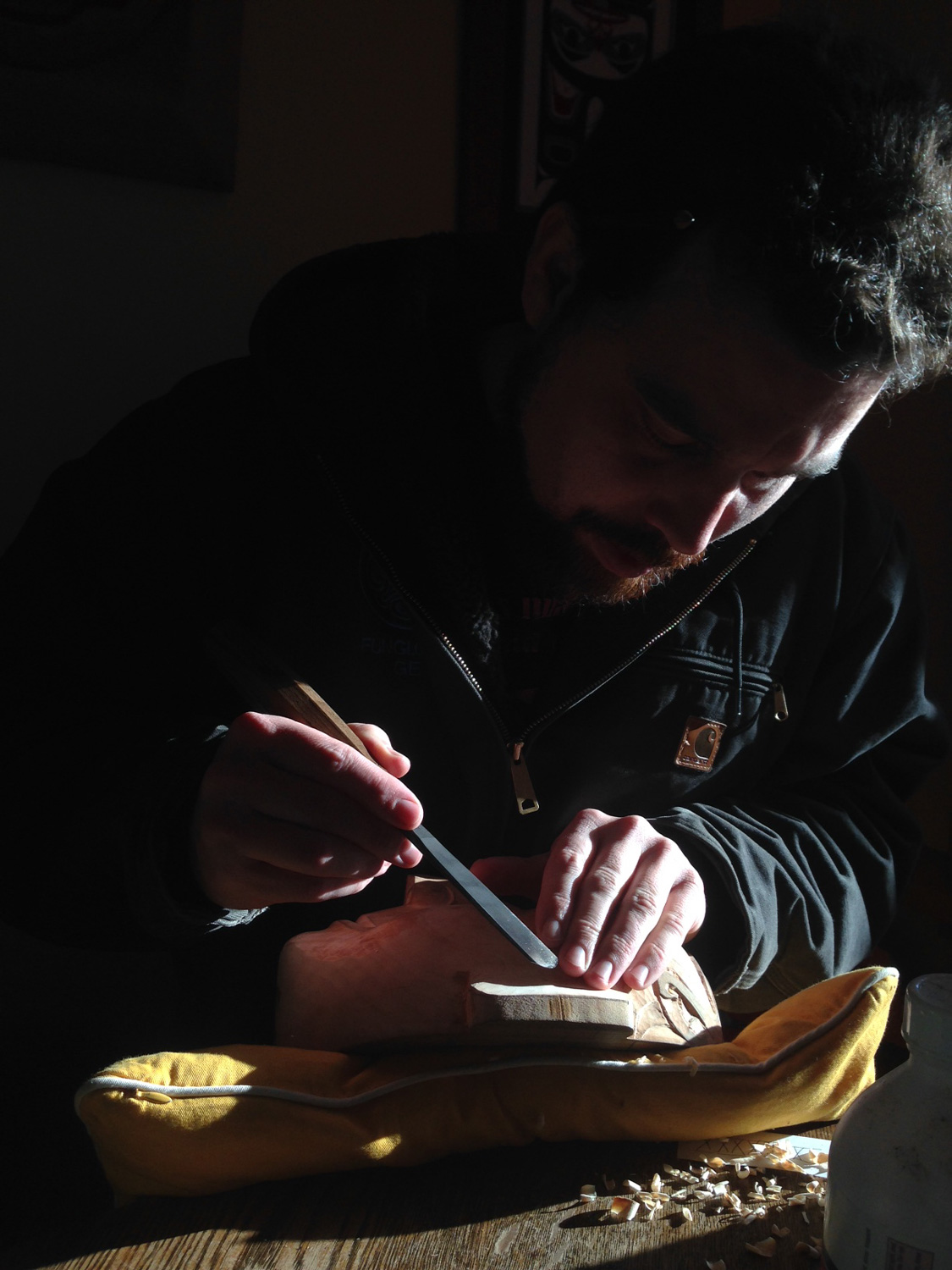 Under a blanket of secrecy, Gwaai and Jaalen are producing a series of new, technologically enhanced masks, dance screens and other surprises to come. Through an examination of ancestral works and stories, as well as tapping their own creative resources, they have built up a library of tricks and subterfuge that are contributing to their new works. Concurrent with these pieces, they’re working to create a narrative for performance with choreography. Because of the mystery and surprise at the foundation of this project, our communications and visuals of the progress must be cryptic. We hope the oblique hints and cryptic peeks at the works will entice and excite.